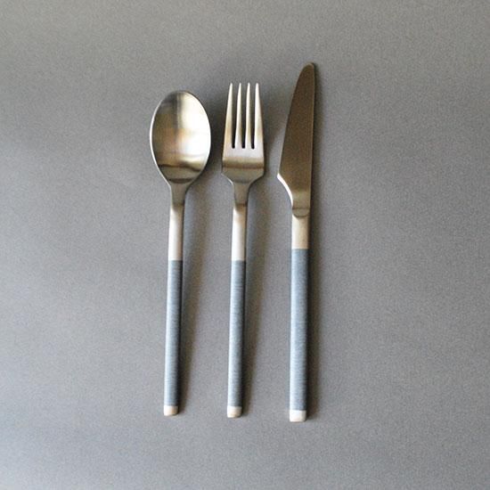 ステンレスのカトラリーに布着せの技法でハンドルを巻いたデザートスプーンとフォーク。