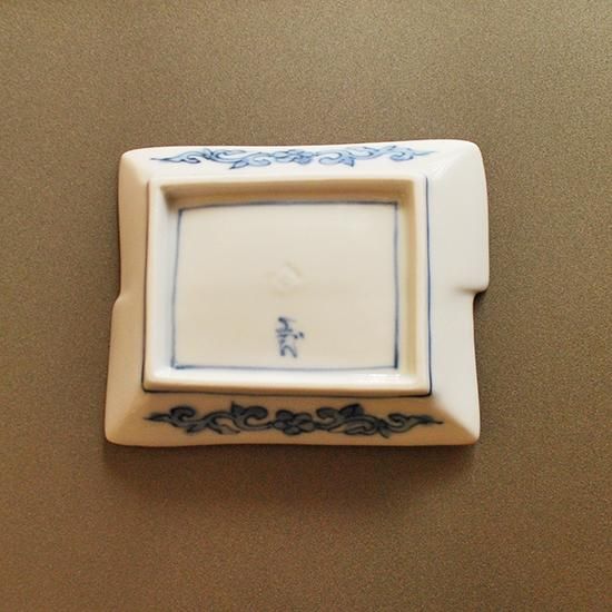 染付の濃淡が美しい角皿です。上段に軽やかなみじん唐草の絵付け、下段には川の流れをイメージさせる曲線に描き分けられた地紋のコントラストが目を引きます。